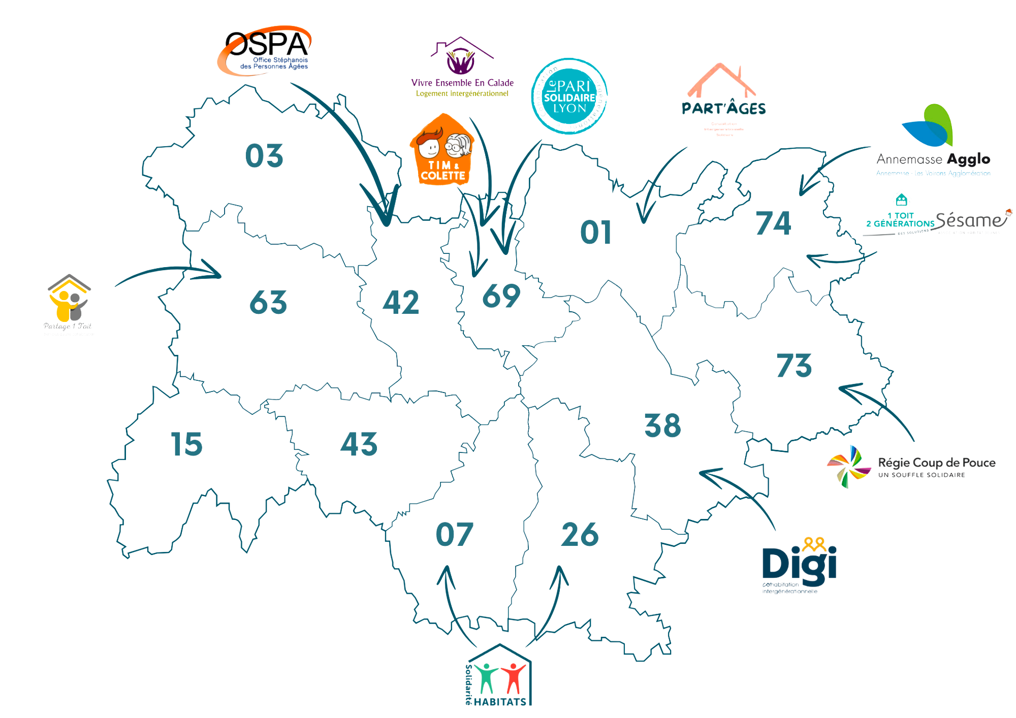 - 8 associations sur 7 départements de la région Auvergne Rhône-Alpes :